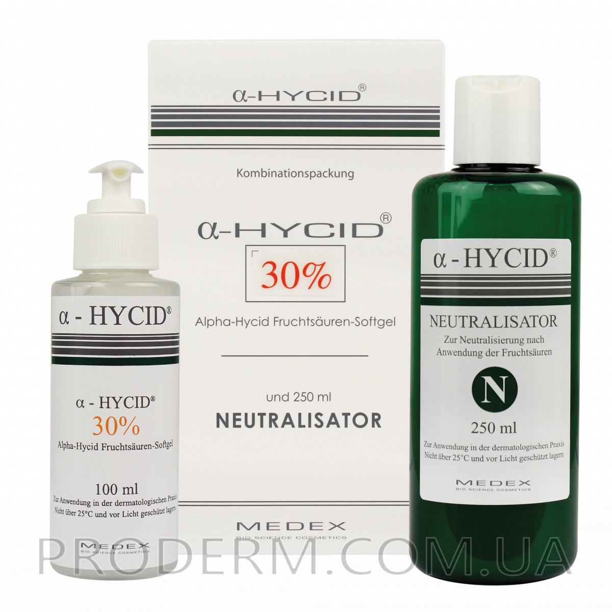 a-HYCID Gel 30% містить фруктові кислоти природного походження (L-молочну кислоту, лимонну кислоту та L-винну кислоту). Коли ці фруктові кислоти наносяться на шкіру, вони зменшують зчеплення між кератиноцитами в нижніх шарах рогового шару (роговий шар) і стимулюють оновлення рогового шару. Покращуються його еластичні та пластичні властивості. Цей позитивний вплив на шкіру можна використовувати для лікування старіння шкіри, гіперкератозу, акне (шрамів від прищів), пігментації та гіперпігментації. Очікується, що фахівець з краси пройшов семінар a-HYCID від Medex перед початком процедури.